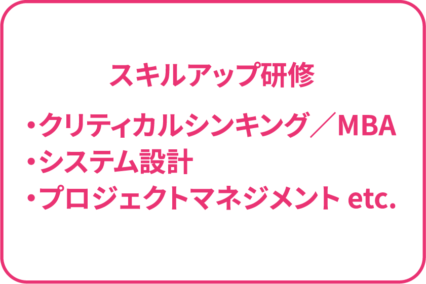 新人・キャリア入社研修、OJT終了後、育成プログラムとして、プロジェクトでの学びが最大化出来るように、必要な人が必要な時に学習できるカフェテリア形式で体系的・網羅的なトレーニングコンテンツを提供しており、学びを通した会社全体のレベルアップを目指します。